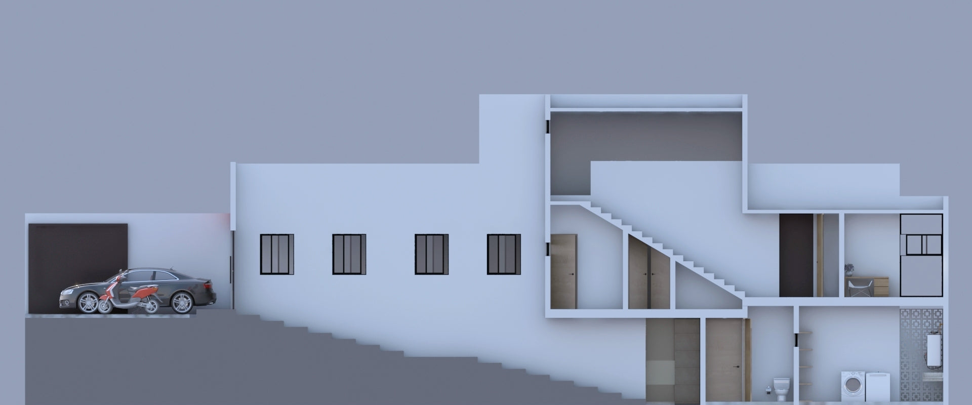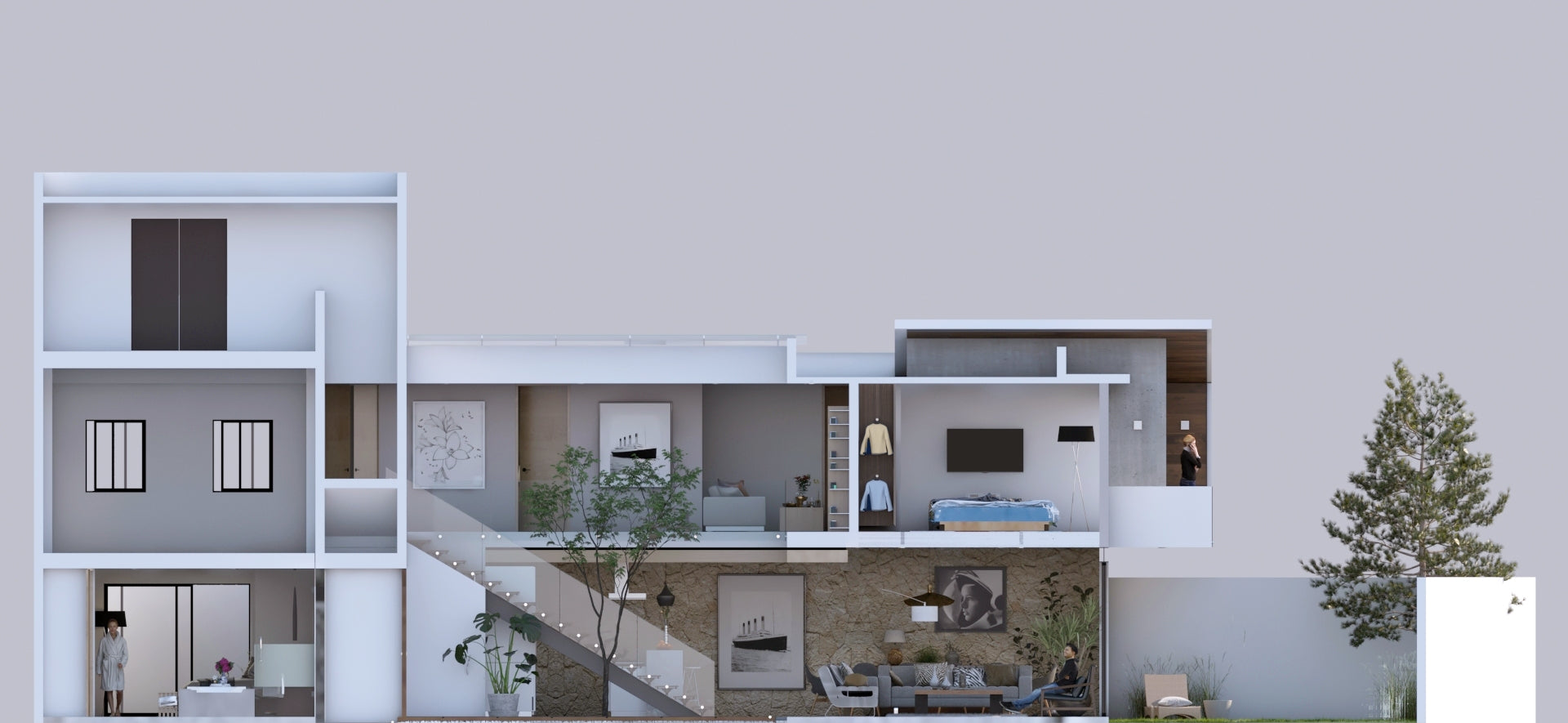 Se trata de una imagen de alta definición que no cuenta con puntos de fuga, sin embargo, expresa mucho más que un simple alzado o una planta CAD, ya que cuenta con iluminación (penumbras), texturas realistas, mobiliario y ambientación 3D.